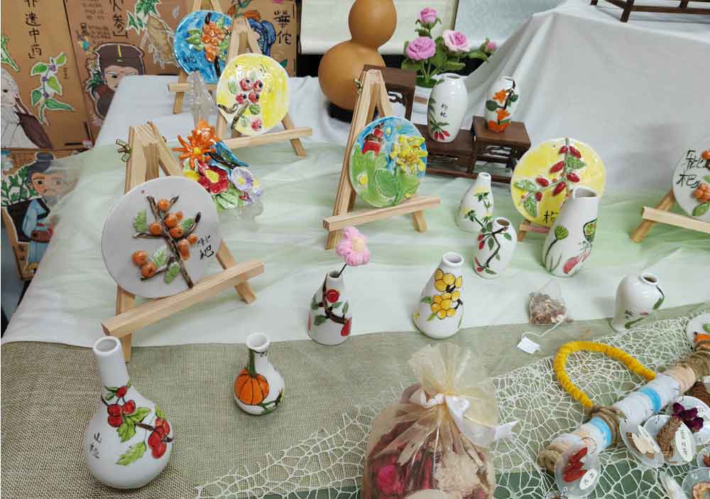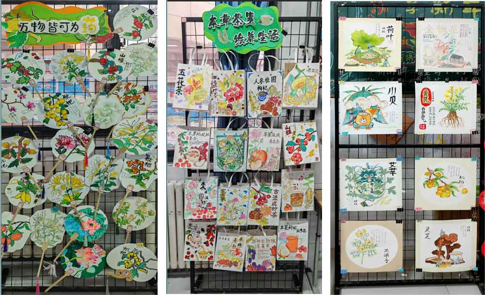 同学们绘制了中药草扇面,原来生活中常见常用的山楂、陈皮、忍冬、枇杷这些植物药画出来就是一幅美丽的画作,中草药就是来自大自然的恩赐。还有很多同学一纸袋上作画,画出了自己设计的中药茶,有五花茶、人参桂圆枸杞茶、苹果枸杞红枣茶、苹果玫瑰养生茶、洛神花玫瑰桑葚茶,悦目的花色、可口茶色、与可爱的茶壶、杯子构与一幅幅美丽的图案;同学们还绘制了治疗厌食的茶、治疗失眠的茶、治疗咳嗽的茶,每一种茶都写上它的食材、功能、主治以及制作方法。